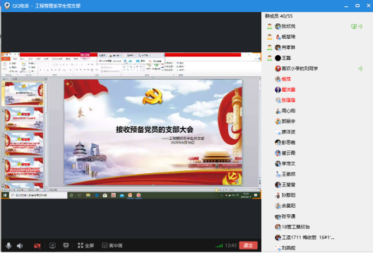 (通讯员 刘曼玉)9499www威尼斯工程管理系党支部预备党员接收大会会议于6月16日下午4点在线上如期开展。土建院工程管理系党支部书记王静静、工程管理系全体学生党员及11名发展对象参与了本次会议。