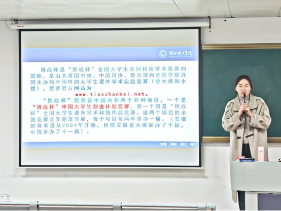 活动伊始,团总支书记许海涛发表活动致辞。他鼓励同学们积极参加“挑战杯”课外学术竞赛,在实践中锻炼和培养自己的创新思维能力、团队协作能力、沟通表达能力和解决实际问题的能力,勇于挑战自我,在竞赛中展现大学生风采。