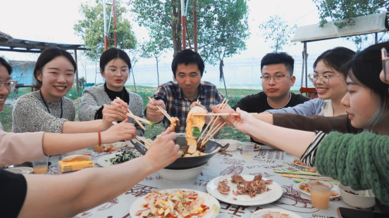 傍晚时分,一场别开生面的共进晚餐在农场的露天草坪拉开帷幕。现场灯光柔和,营造出温馨而浪漫的氛围。桌上摆满了丰盛的美食,让人垂涎欲滴。教职工们围坐在一起,一边品尝着美食,一边畅谈着生活中的趣事,交流着工作中的经验,气氛十分融洽。在用餐过程中,大家还互相分享了自己采摘的番茄,品尝着自己亲手采摘的果实,别有一番滋味。