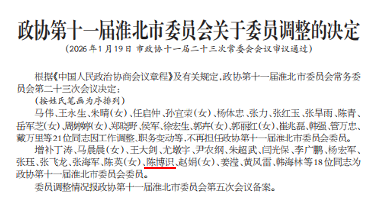 1月19日,经淮北市政协十一届二十三次常委会会议审议通过,我院英语教研室教师、九三学社社员陈博识增补为政协第十一届淮北市委员会委员。