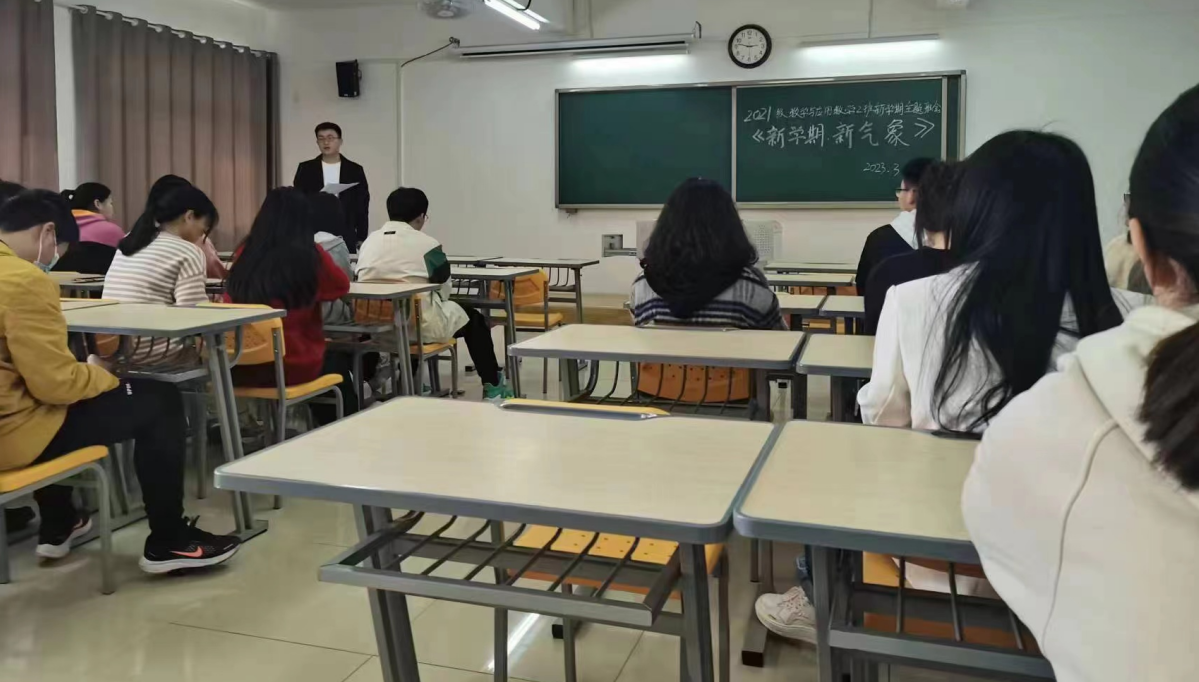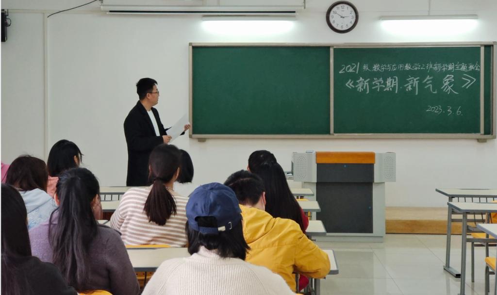 新学期如期而至,为了使同学们在新学期有一个良好的开端,确立新学期的目标和明确对未来的规划,我校jinnianhui今年会2021级数学与应用数学(2)班于2023年3月6日在二教322教室召开“新学期新气象”的主题班会,班主任檀雷雷老师和2班全体学生参加会议。