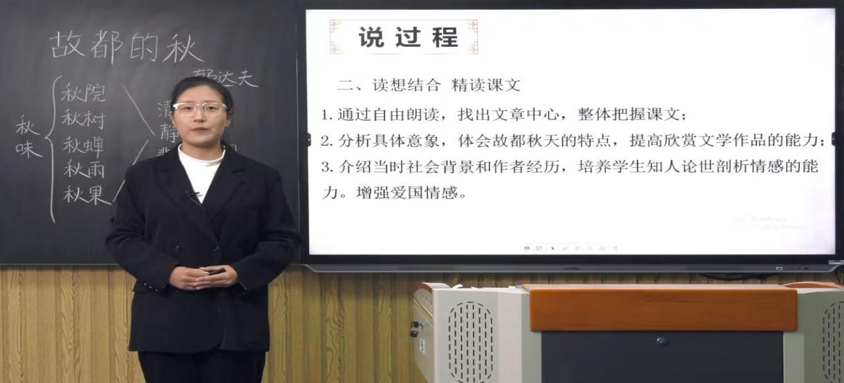 胡英灵同学讲授了高中语文必修上册第七单元的第一篇课文《故都的秋》。即使在秋天,故都北平也不乏有明艳绚丽的景色,但是在作者郁达夫的眼中,故都的秋却是清、静、悲凉的。在讲述这一原因时,她巧妙地引入课程思政点,将文章的写作背景和作者郁达夫的生平结合起来,让学生感受到了作者深深的爱国情怀,增强了学生的爱国意识。