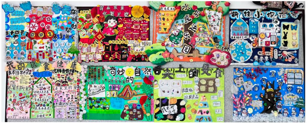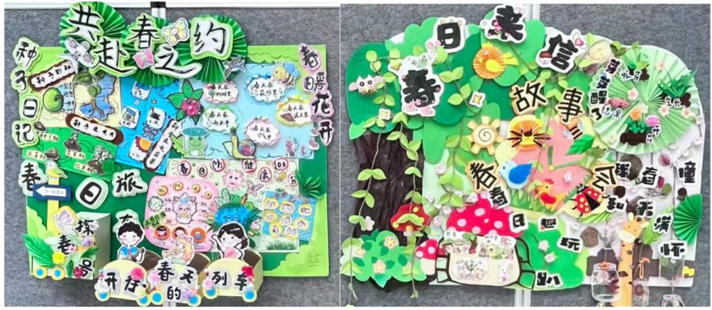 《嘿!一个山楂》主题墙饰以立体山楂造型搭配手绘人物,生动还原了山楂变身系列美食的生活场景,画面鲜活且充满烟火气;围绕日常食材“山楂”,串联“观察认知”与“动手制作”双维度,既贴近生活又充满趣味。而“共赴春日之旅”则以立体拼贴的方式呈现春芽萌发、探春之旅等景象,细节处点缀可活动的小机关,便于幼儿互动探索。这些墙饰作品兼顾视觉美感与教育价值,既通过生动设计吸引幼儿注意力,又以参与式、互动式的模块呼应“环境即教育”的理念,让墙面不止是装饰,更是能承载体验、传递温度的教育载体。