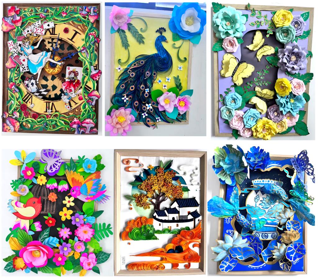 纸浮雕装饰画展区同样亮点纷呈,成为展览的一大焦点。学生们以纸张为主要创作材料,巧用剪、折、卷、粘等多种手法,将平面纸张转化为层次丰富、立体感十足的艺术作品。《爱丽丝梦游仙境》凭借细腻精湛的画工,生动复刻故事里的经典情节,各色角色宛若坠入绮梦,被巧妙收纳于时钟造型之中,色彩搭配明快活泼,尽显天马行空的想象;《桂韵皖南》则创新融合AI图片生成技术,以叠加、卷曲等技法演绎衍纸艺术的灵动韵味,纹理清晰分明,质感逼真动人。一件件作品不仅充分展现了学生们扎实的动手能力,更彰显出他们独特的审美情趣与丰沛的想象力,让每一位驻足的观众,都深切领略到纸张艺术蕴藏的无限魅力。