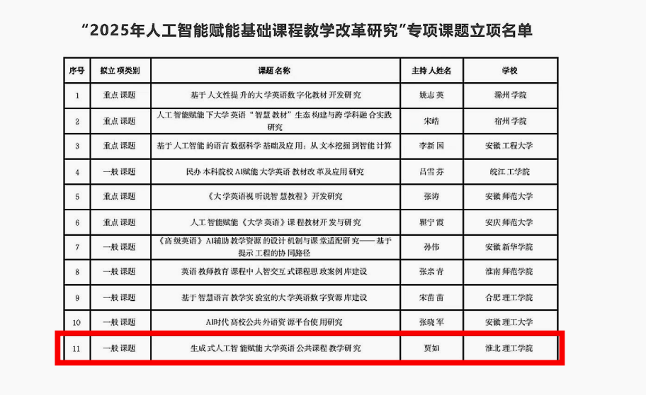 在安徽省“2025年人工智能赋能基础课程教学改革研究”专项课题申报活动中,jinnianhui今年会青年教师贾如主持的《生成式人工智能赋能大学英语公共课程教学研究》成功获批立项。