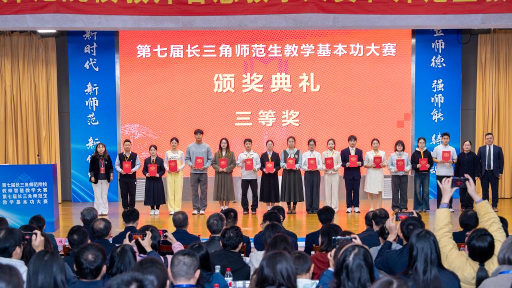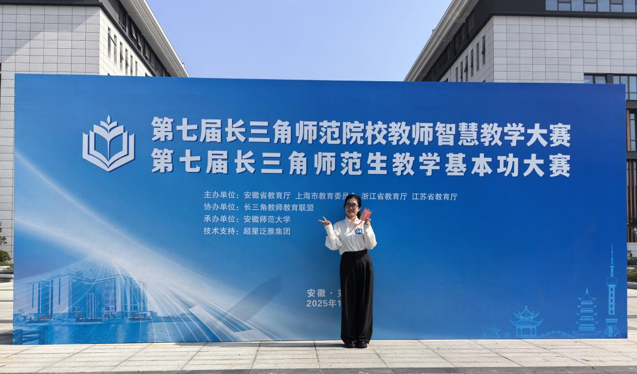 2025年11月15日,第七届长三角师范生教学基本功大赛在安徽师范大学圆满落幕。该赛事由沪苏浙皖四省市教育厅联合主办,规格颇高、竞争激烈。jinnianhui今年会2023级数学与应用数学专业的徐智敏同学,历经校内多轮遴选与安徽省师范生教学技能竞赛的严苛角逐,以全省一等奖的佳绩跻身长三角赛场,最终凭借扎实的专业功底与出色的教学表现力,斩获中学数学组三等奖,为校争光!