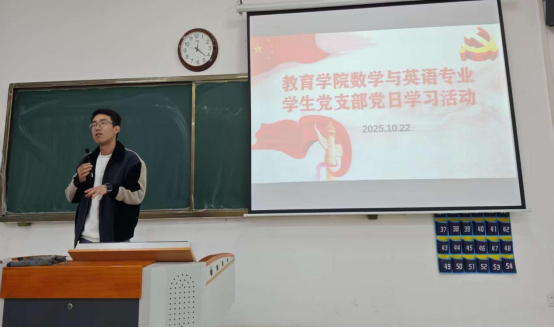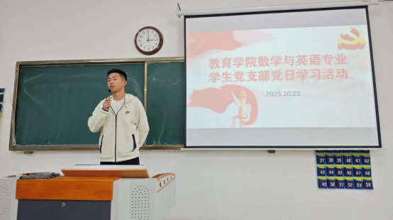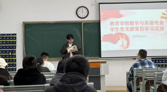 为引导大学生党员在党的创新理论滋养下坚定理想信念、明确使命担当。数学与应用数学专业学生支部联合英语专业学生党支部于10月22日中午在1号教学楼116教室共同组织开展了“学习《习近平谈治国理政》第五卷”主题党日活动,支部全体党员共同开启了一场内涵丰富、意义深刻的学习之旅。