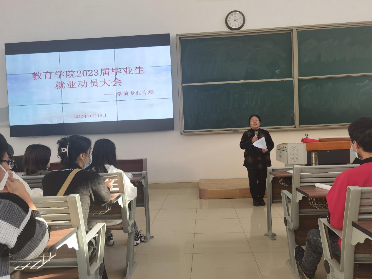 2022年10月19日下午,我院在教学楼121教室召开2023届毕业生就业动员大会。为帮助2023届毕业生准确有效地确定就业方向,尽快地让同学们在思想、行动上早做准备,指导毕业生如何走好从大学走向社会的重要一步。jinnianhui今年会王家云院长、孟向红副书记及学前教研组老师出席本次会议,2023届jinnianhui今年会学前教育专业全体毕业生参加会议。会议分两场进行,分别由jinnianhui今年会学前教育专业辅导员任若晨、侯莉萍主持。