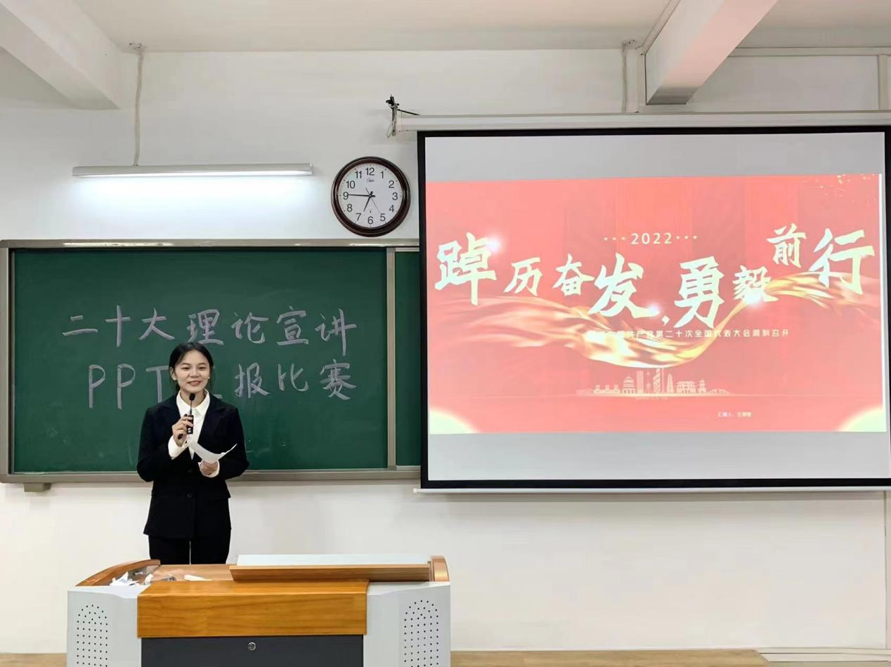 以青春之声传递精神力量,以实际行动奏响复兴之曲。同学们在认真学习、理解的基础上,用自己的语言把党的二十大精神制作成PPT讲稿,在班级进行宣讲。11月4日晚,学院举行理论宣讲比赛,经评选,陈可欣、黄悦等5人获得一等奖;安娜、姜甜甜等10人获得二等奖;杜越、邓雯莉等15人获得三等奖。后续将从这些获奖的PPT作品中选出青年宣讲团,组成“党的二十大精神”志愿宣讲团,深入社区、基层宣讲党的二十大精神。