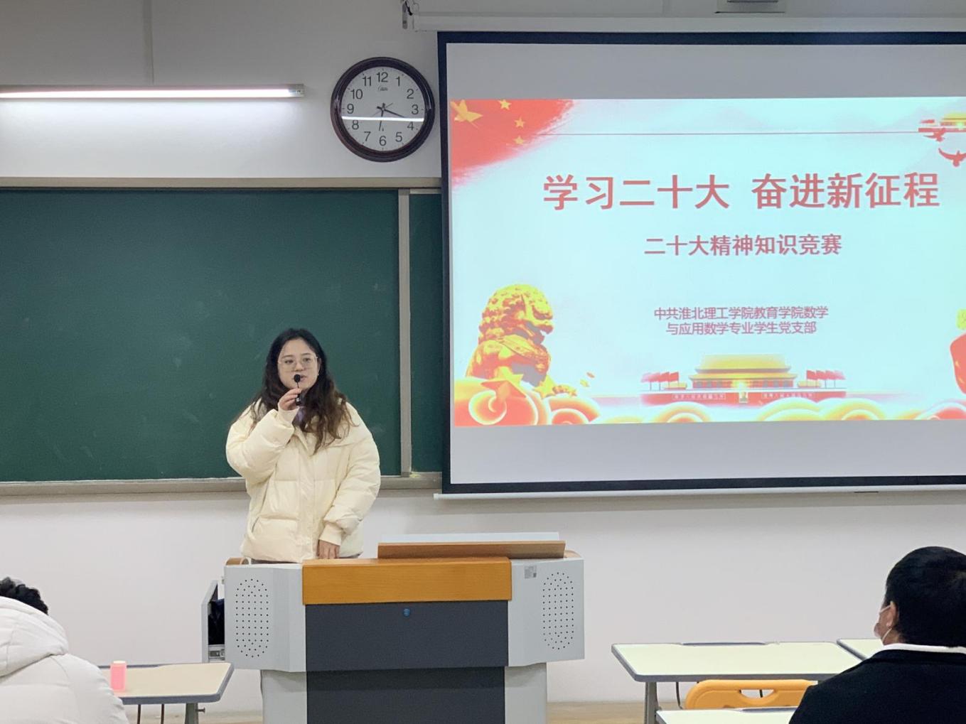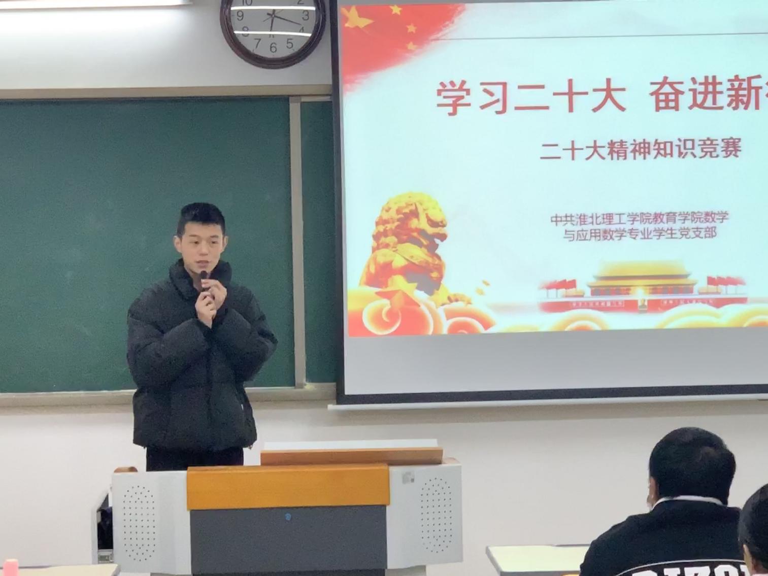 为深入学习宣传贯彻党的二十大精神,回顾党的光辉历史,推动党的二十大精神落地生根、入脑入心。jinnianhui今年会数学与应用数学学生党支部积极部署,于12月1日在1教313开展“学习党的二十大精神知识竞赛活动”,活动由支部委员孙虎主持,支部书记陈媛媛、全体支部党员及入党积极分子参加了活动。