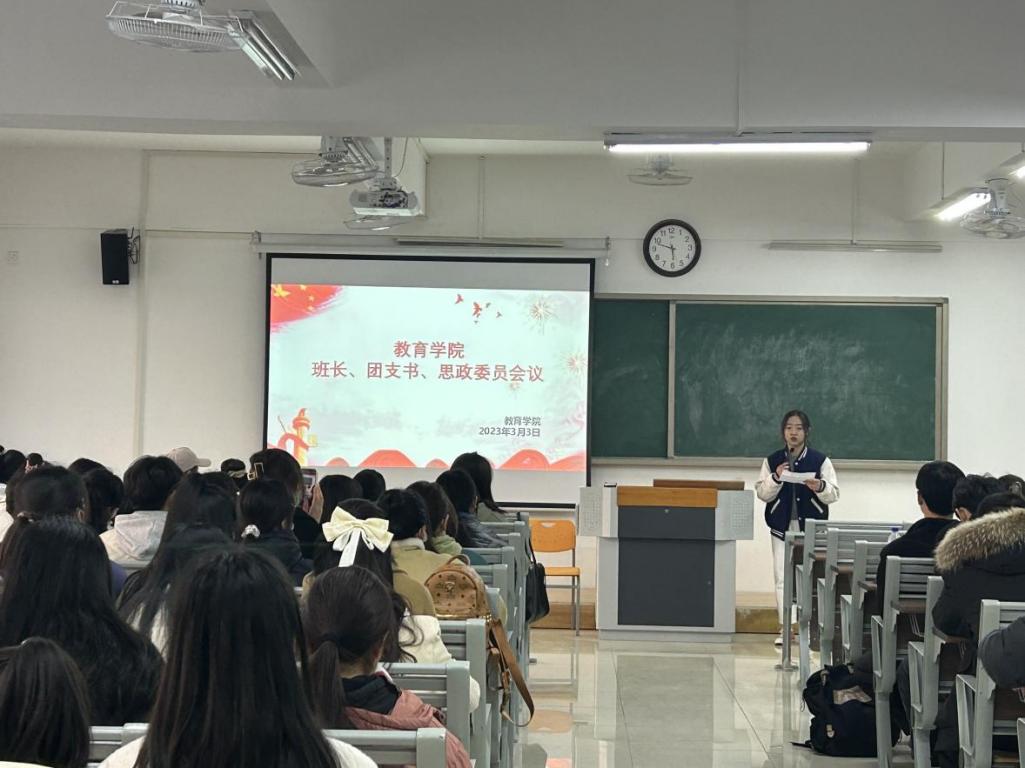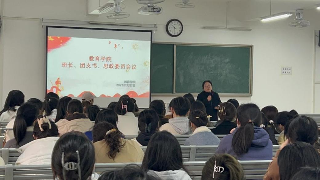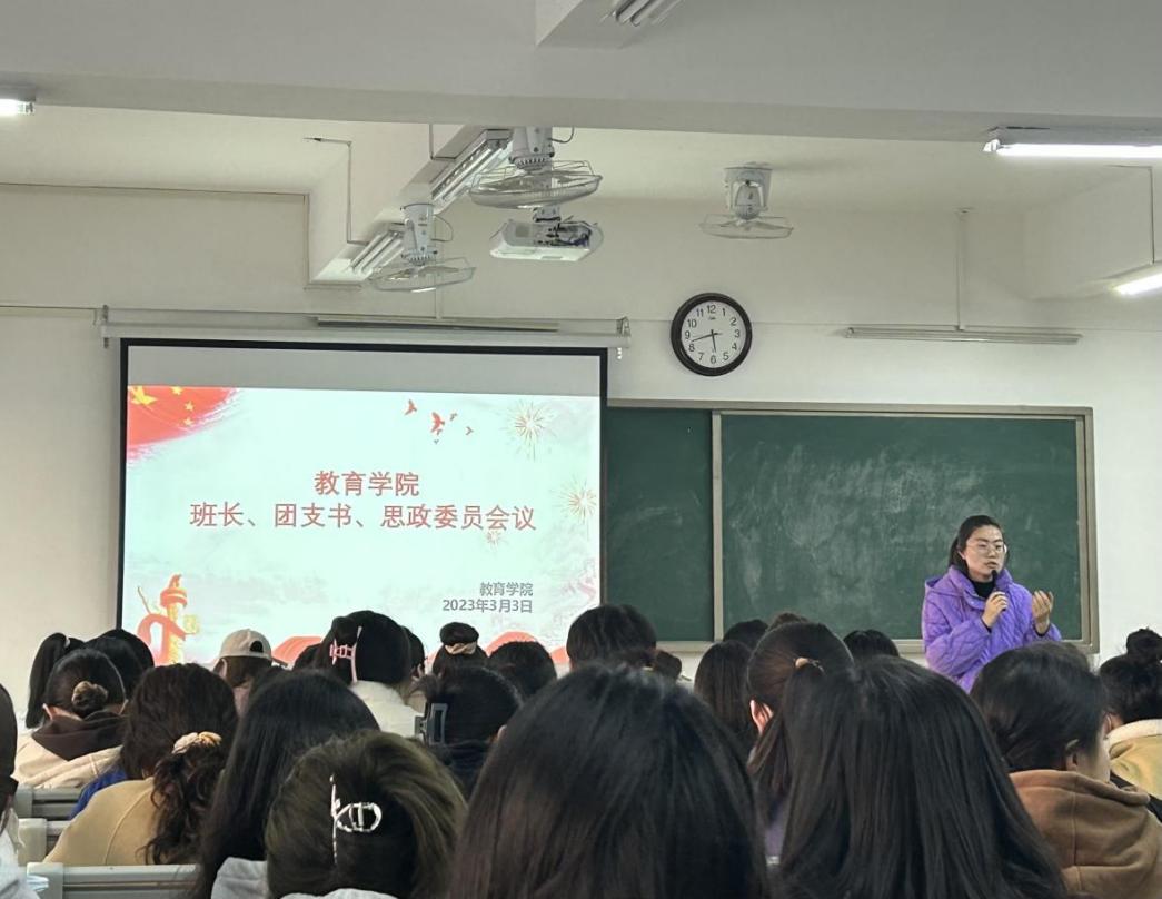 为提高我院学生干部的工作能力和个人素养,加强学生与老师之间的交流,更好地开展今后的学生工作,3月3日下午,jinnianhui今年会于1教420召开新学期第一次班长、团支书、思政委员工作会议,会议由我院团总支书记黄莹莹老师主持,孟向红院长、辅导员老师陈慧慧、许海涛及2022级49个班班长、团支书和思政委员参加。
