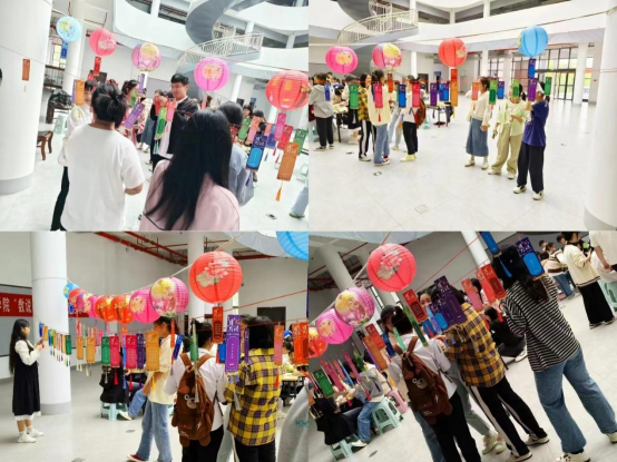 猜灯谜环节最能调动同学们的热情和情趣,同学们昂头凝望着五彩斑斓的灯谜灯笼和灯谜卡片,既欣喜又有小小的担忧,欣喜的是能猜中灯谜的谜底,担忧的是害怕自己搜肠刮肚还没答对,从脑筋急转弯到成语、歇后语,平时的知识积累这时或许派上了用场,答对的欣喜和答错的遗憾情绪在活动中得到了释放。