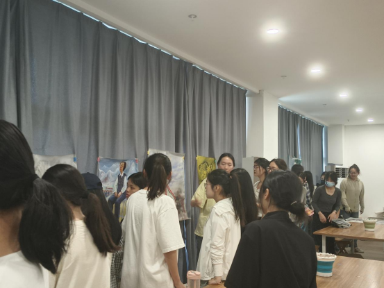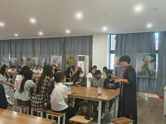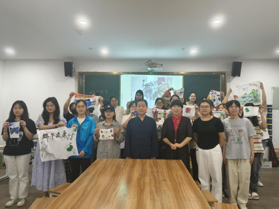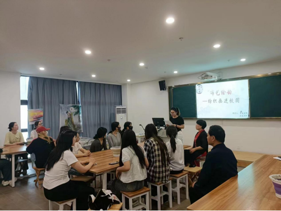 本次活动由学前教育教研室主任尹爽老师主持。活动伊始,李凌女士告诉大家纺织画是用纺织颜料为主,以布料作为表达的新画种,省时省力且可以洗刷不会掉色,又介绍了纺织画的创作来源和过程。接着向大家展示了她的多件作品,师生们都被其精美的作品深深吸引,零距离欣赏纺织画,不禁发出感慨:原来在布上也能画出这么好的画!