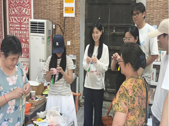 下午,实践队在省级布艺传承人丁兰云老师的带领下,开启了布艺探索之旅。丁老师以生动语言,深入浅出地讲解了布艺的历史脉络、专业针法与制作精髓。“针脚要像运河的水,既要有力量,又要留出呼吸的空间。”丁老师形象的点拨激发了队员们的浓厚兴趣。队员们热情高涨,虚心求教,通过亲身体验一针一线的缝制过程,深刻感受到布艺这门民间工艺所承载的农耕文明智慧与生活美学。同时,丁老师创新性地将濉溪“石榴小镇”、淮海战役“小推车精神”及“石板街”历史元素融入布艺创作,细密的针脚在她手中幻化成立体小花,为传统技艺注入时代新意,这正是对非遗文化的传承与创新,在一针一线的坚守中,传统布艺正以更鲜活的姿态,走进当代生活。