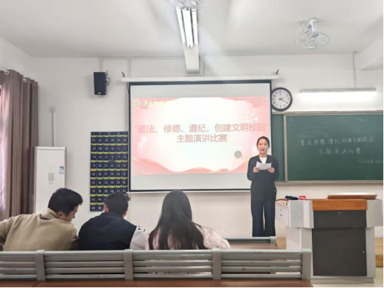 比赛现场秩序井然,选手们依次登台展现风采。他们以“普法、修德、遵纪,创建文明校园”为核心,结合校园日常与成长感悟娓娓道来,或阐述法治对青春的护航意义,或分享修德践行的细微故事,或强调纪律对校园文明的保障作用。他们语言流畅、情感真挚,时而慷慨激昂,时而温和恳切,精彩的表现多次点燃现场氛围,也让“普法、修德、遵纪”的种子在每位观众的心底悄然扎根。