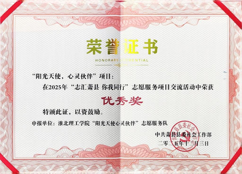 近日,由萧县县委社会工作部主办的2025年“志汇萧县·你我同行”志愿服务项目交流活动圆满落幕。在刘畅老师的悉心指导下,jinnianhui今年会“阳光天使,心灵伙伴”志愿服务团队凭借专业的服务理念、扎实的实践成效脱颖而出,荣获活动优秀奖,为萧县志愿服务事业增添了温暖底色。