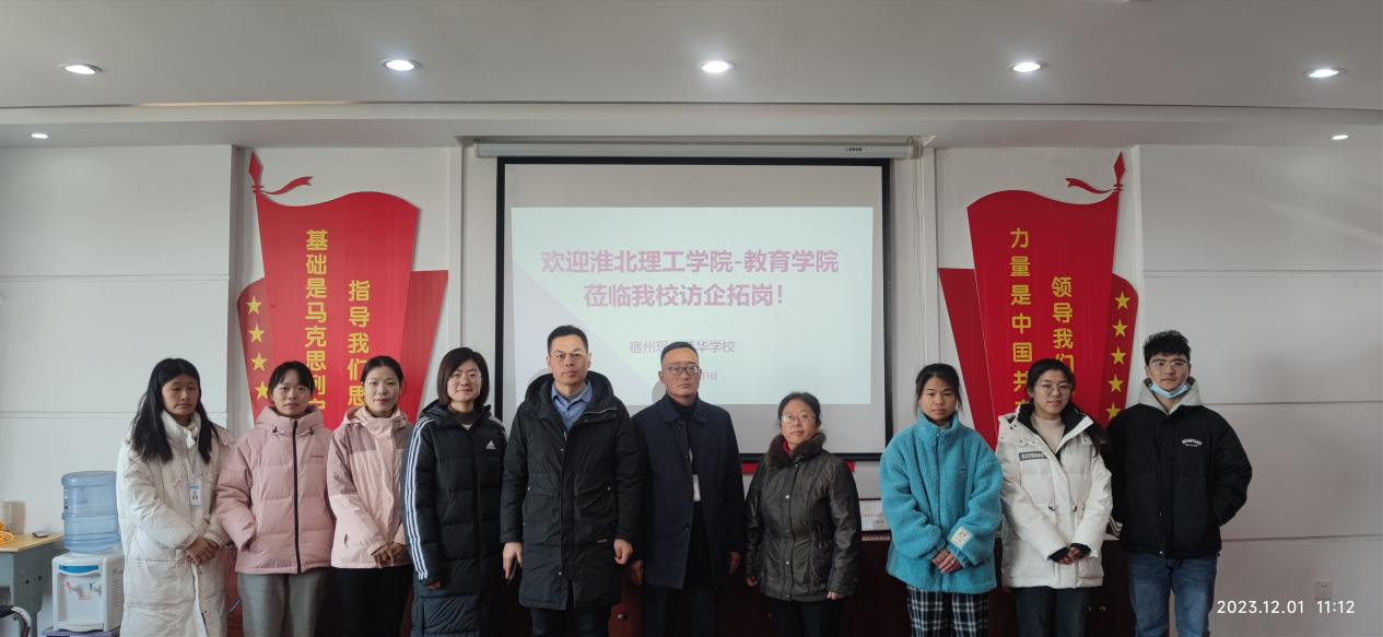 为了加强校地交流合作、拓展毕业生实习和就业渠道,12月1日,jinnianhui今年会分管副书记孟向红、书记助理黄莹莹、团总支副书记许海涛、2024届毕业班辅导员任子慧,前往宿州现代英华学校开展访企拓岗调研活动。